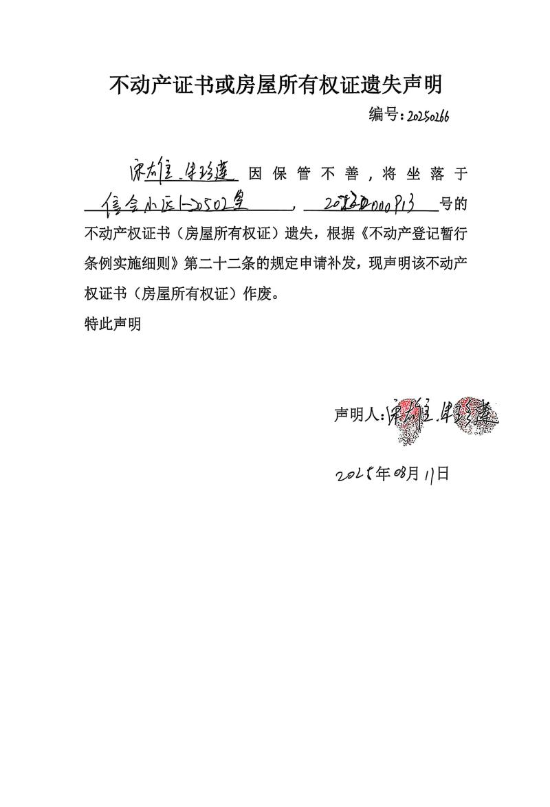 宋雄、朱珍蓮不動產證書或房屋所有權證遺失聲明,編號:20250266