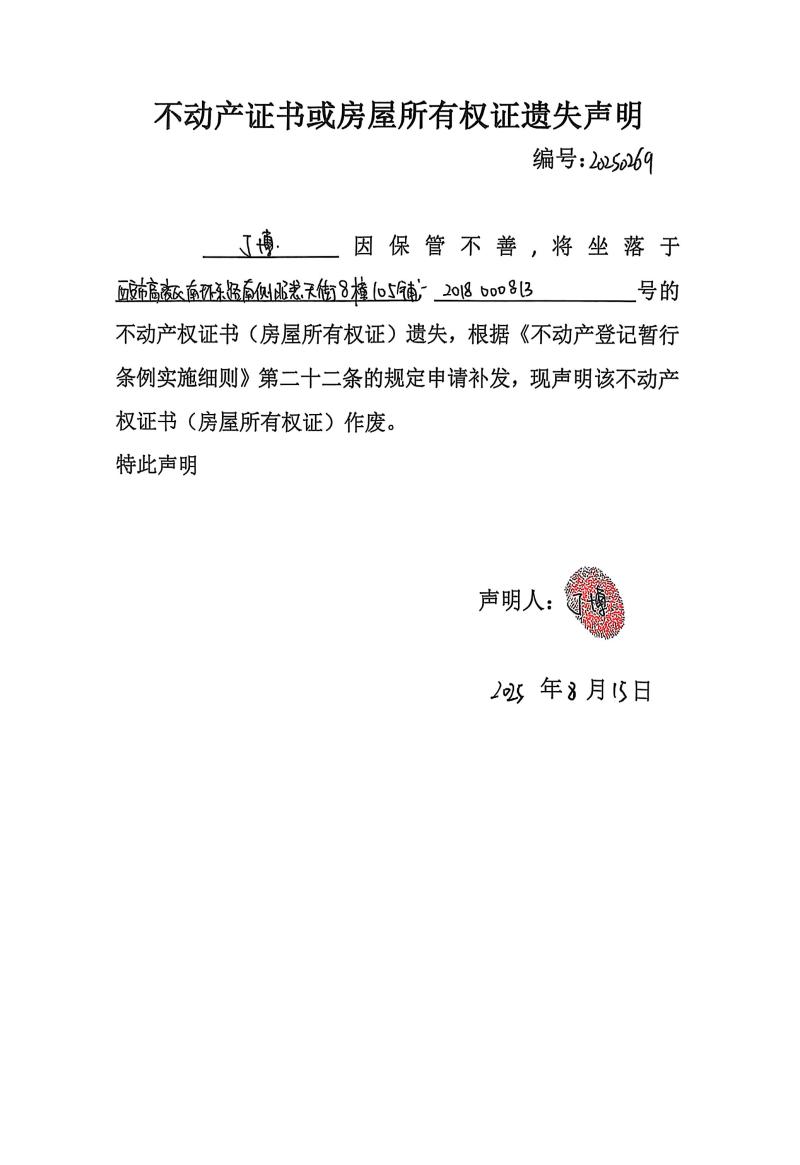 丁博不動(dòng)產(chǎn)證書或房屋所有權(quán)證遺失聲明,編號(hào):20250269