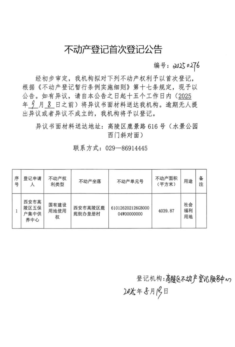 西安市高陵區五保戶集中供養中心不動產登記首次登記公告,編號:20250276