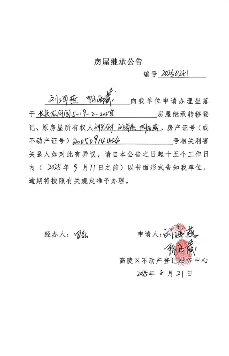 劉海燕、陰西藏房屋繼承公告,編號(hào):20250281