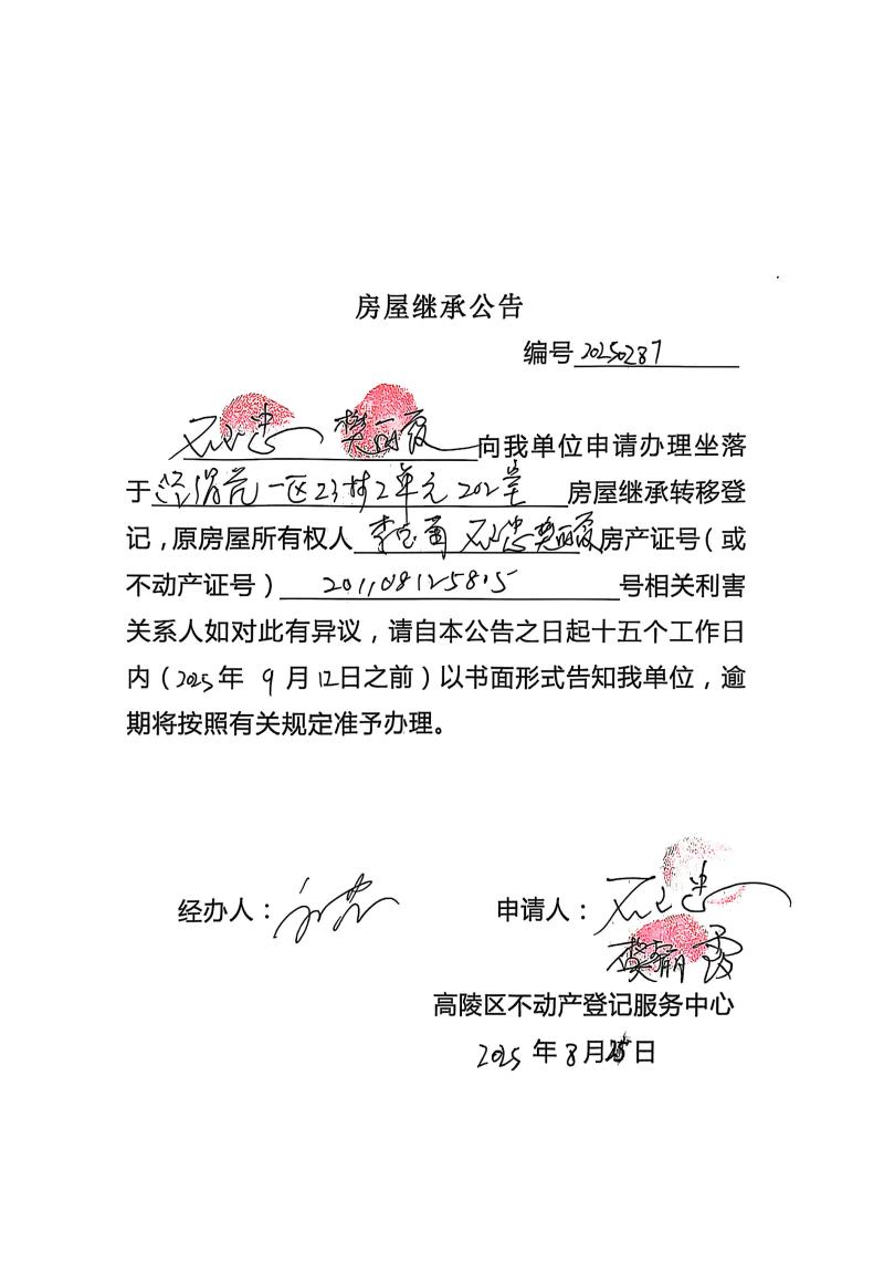 石玉忠、樊麗霞房屋繼承公告,編號:20250287