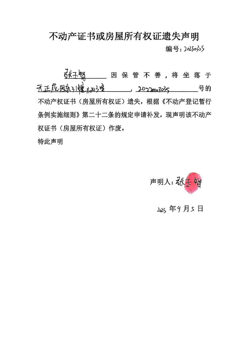 張玉智不動產證書或房屋所有權證遺失聲明,編號:20250305