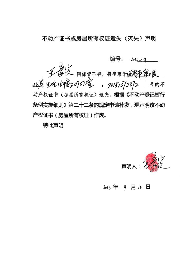 王毅不動(dòng)產(chǎn)證書或房屋所有權(quán)證遺失(滅失)聲明,編號:20250319