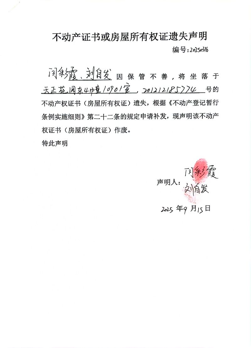 閆彩霞、劉自發不動產證書或房屋所有權證遺失聲明,編號:20250316