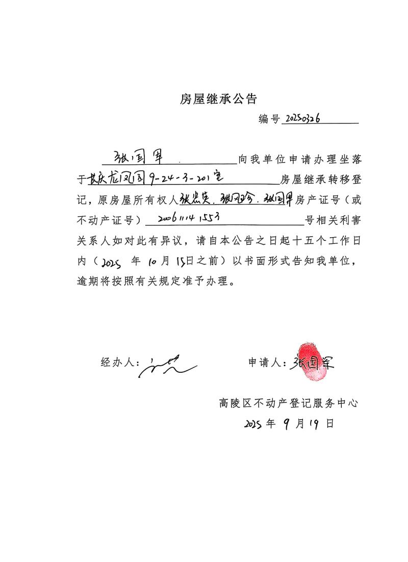 張國(guó)軍房屋繼承公告,編號(hào):20250326