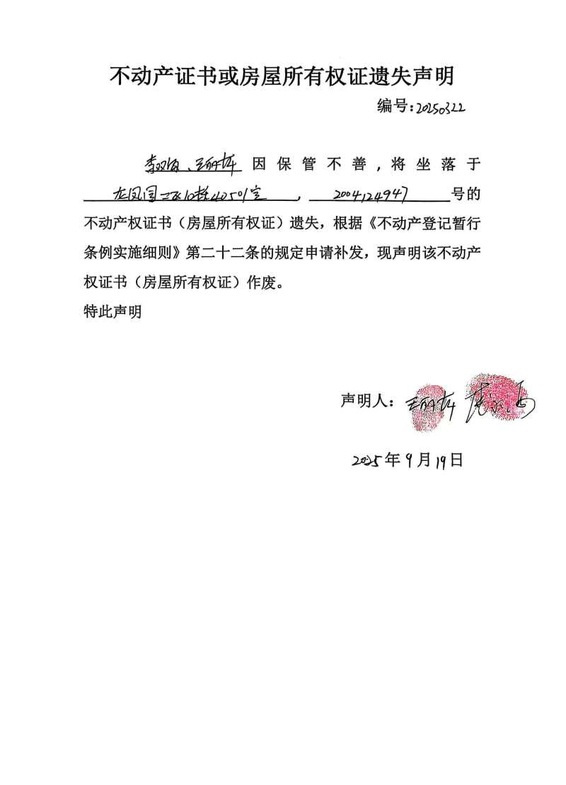 李雙海、王麗萍不動產證書或房屋所有權證遺失聲明,編號:20250322