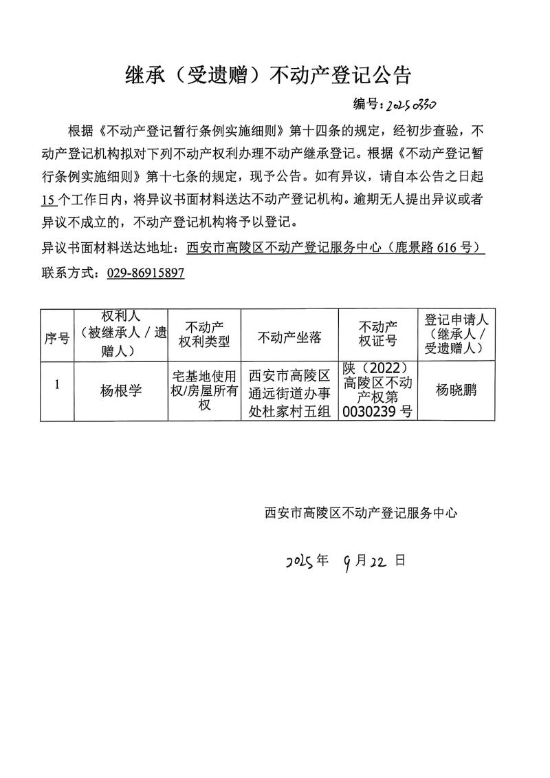 楊曉鵬繼承(受遺贈)不動產登記公告,編號:20250330