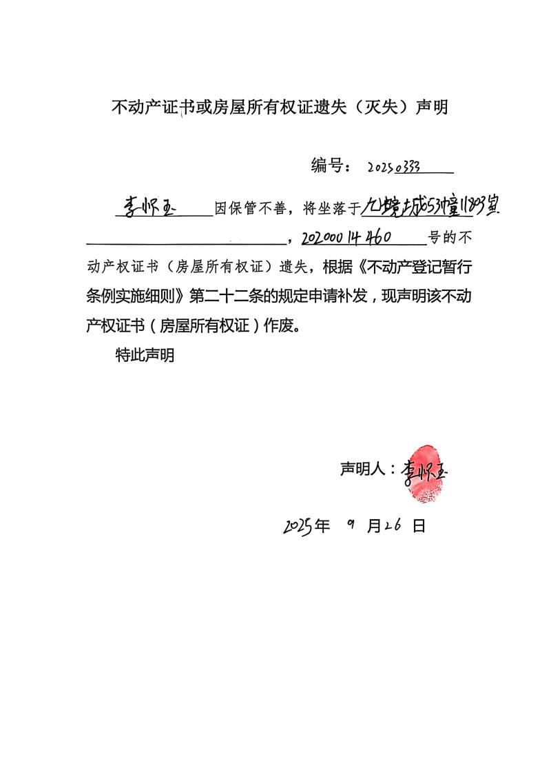 李懷玉不動產證書或房屋所有權證遺失(滅失)聲明,編號:20250333