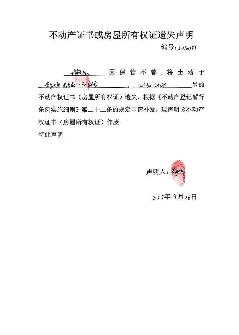 武銳東不動產證書或房屋所有權證遺失聲明,編號:20250331