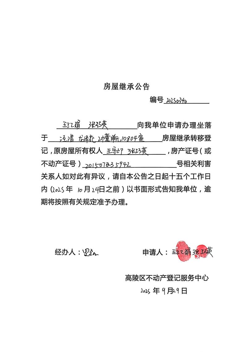王紅娟、張巧英房屋繼承公告,編號:20250340