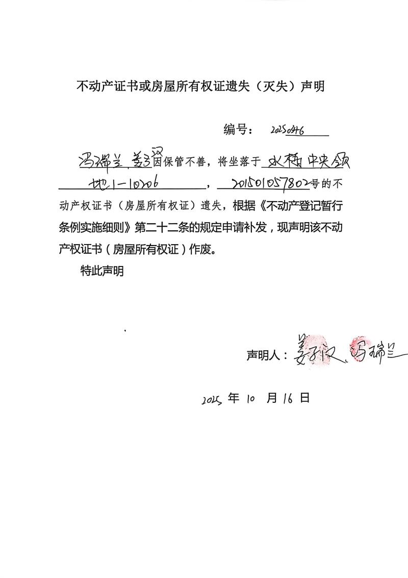 馮瑞蘭、姜子漢不動產證書或房屋所有權證遺失(滅失)聲明,編號:20250346