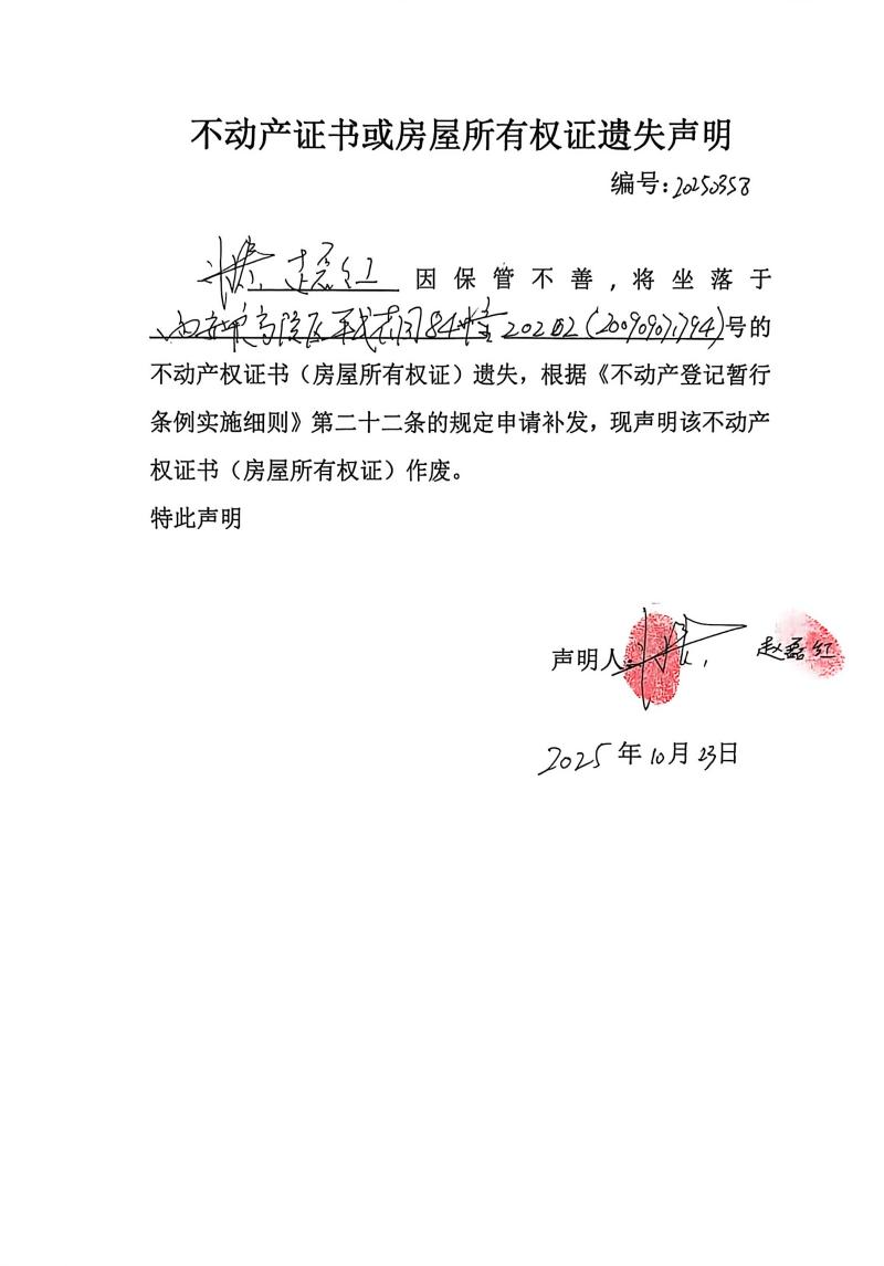 劉瑧、趙磊紅不動產證書或房屋所有權證遺失聲明,編號:20250358