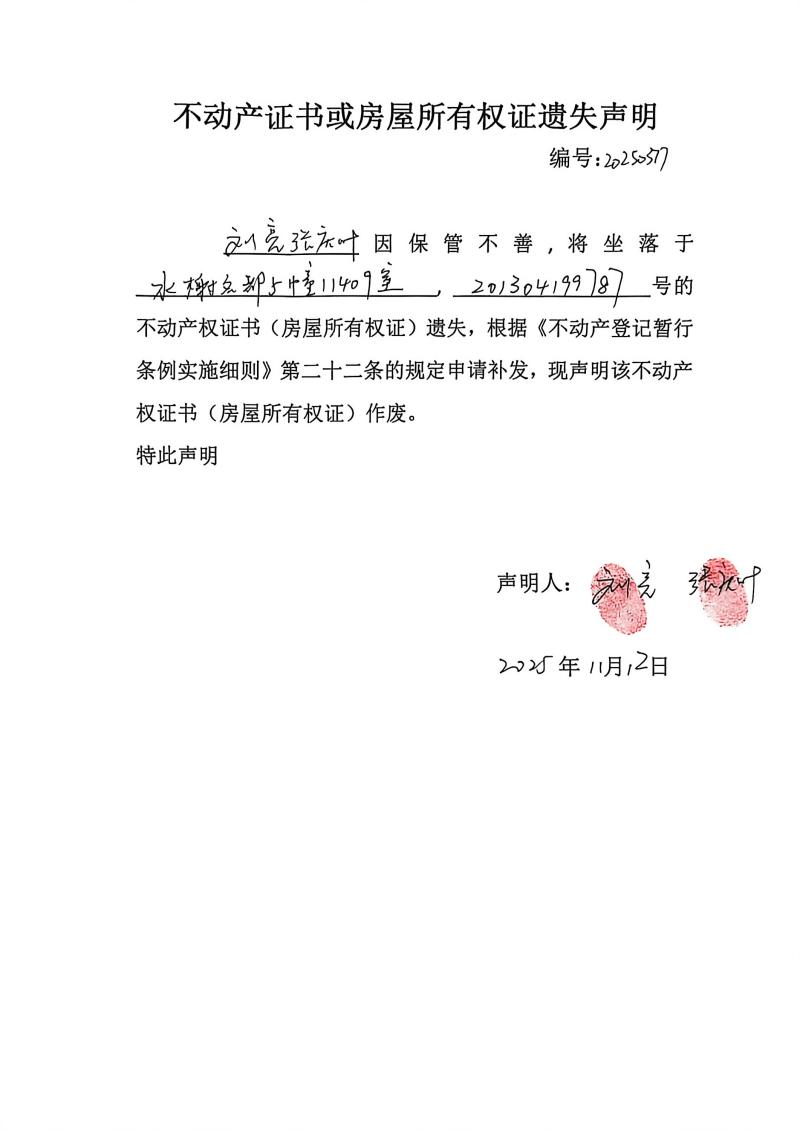 劉亮、張慶葉不動產(chǎn)證書或房屋所有權(quán)證遺失聲明,編號:20250377