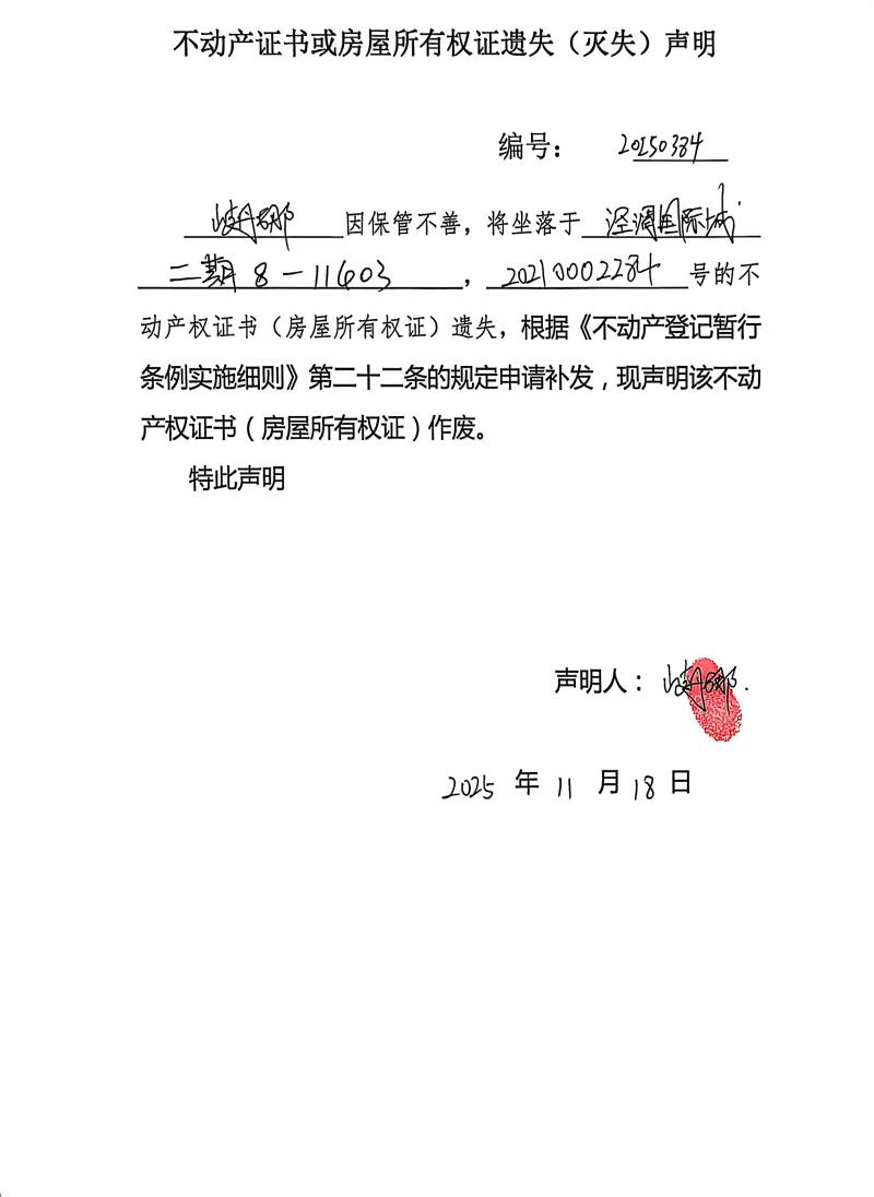 岐丹娜不動產證書或房屋所有權證遺(滅失)失聲明,編號:20250384