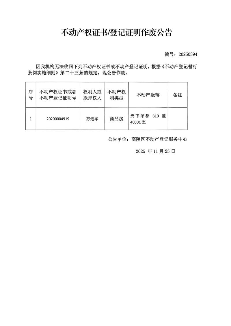 蘇進軍不動產權證書/登記證明作廢公告,編號:20250394