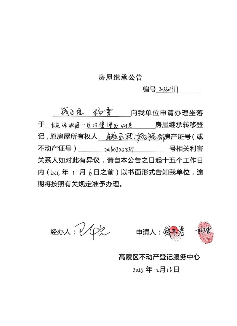 錢玉君、楊雪房屋繼承公告,編號:20250417