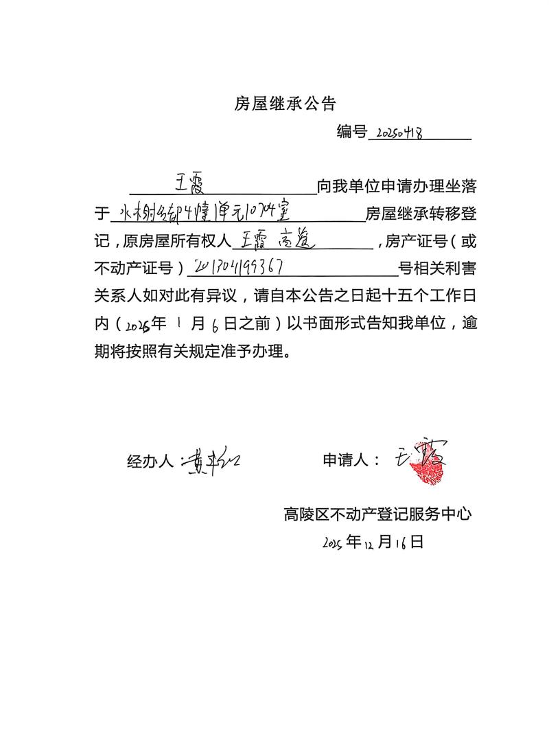 王霞房屋繼承公告,編號:20250418