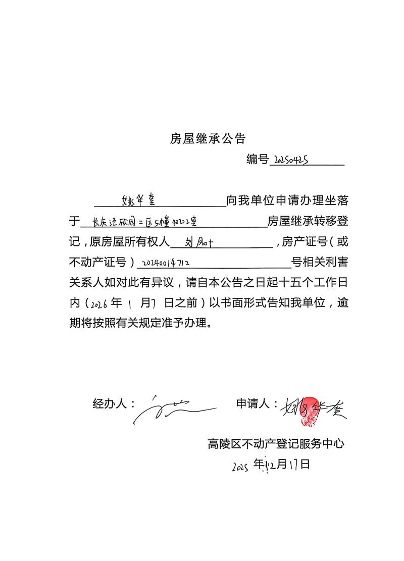 姚華奎房屋繼承公告,編號:20250425