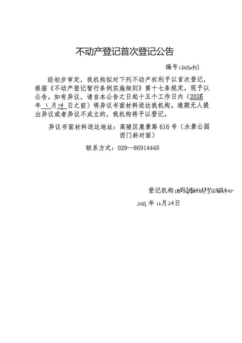 不動產登記首次登記公告,編號:20250431