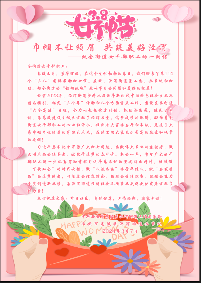 春暖三月,芳華綻放。在第114個“三八”國際勞動婦女節(jié)到來之際,涇渭街道組織開展系列慶“三八”主題活動,傳遞關愛女性聲音,關注女性健康和生活,動員全街道女性做“奮發(fā)有為”的追夢使者,以堅定的理想信念、強烈的責任擔當、過硬的能力素質創(chuàng)造新業(yè)績,為涇渭街道經濟社會各項事業(yè)更好更快發(fā)展貢獻巾幗力量!