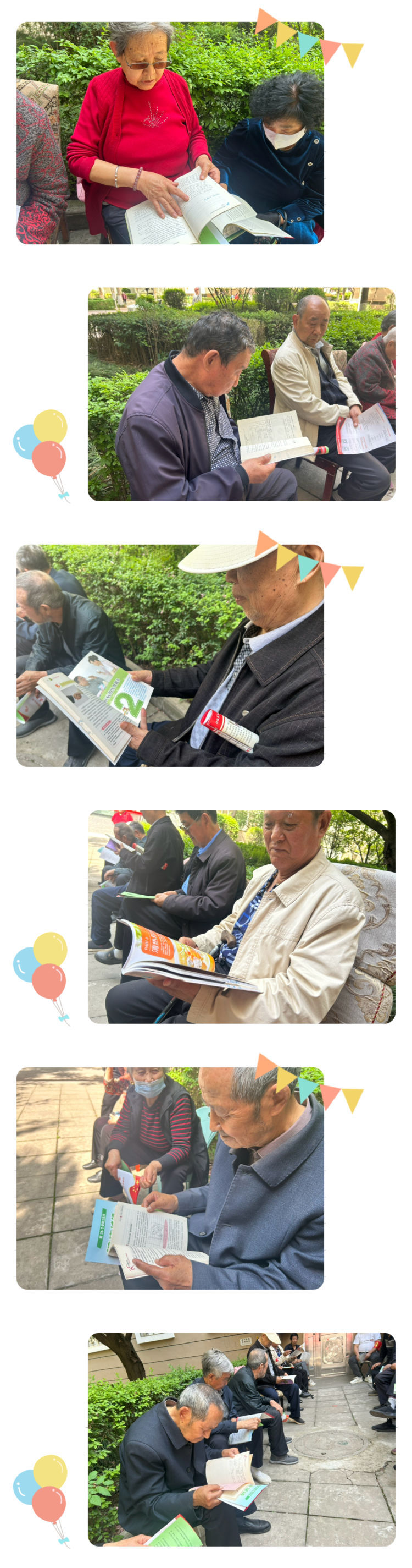 長慶龍鳳園社區工作人員和轄區的叔叔阿姨們一起分享讀書心得,活動中大家就老年慢性病的預防和治療展開激烈討論,共同倡導綠色健康飲食,保持作息規律,適當鍛煉,通過本次讀書分享活動,大家對養生保健方面的意識普遍得到提高。