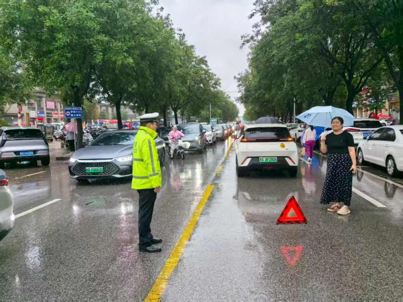二是強化疏導管控,保障通行有序。執勤民輔警提前到崗,冒雨奮戰在路面一線。在主要路口、學校周邊等重點部位,加大指揮疏導力度,引導車輛有序通行,防止發生長時間、大范圍交通擁堵。對積水嚴重暫時無法通行的路段,及時設置警示標志,實施臨時交通管制,并配合相關部門開展排水作業,同時通過喊話、手勢等方式提醒過往車輛、行人繞行避險,注意安全。