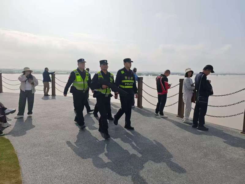 巡邏民警針對近期雨季可能存在的防汛安全隱患,采取步巡加車巡相結合的方式。車巡時,警車持續閃爍警燈,對景區周邊道路進行不間斷巡查,及時發現道路積水、河堤安全等問題;步巡時,巡邏民輔警仔細查看河道水位變化、沿岸設施穩固情況,向在景區附近逗留的群眾宣傳防汛安全知識,提醒他們遠離危險區域,提高自我防范意識 。同時分局反恐怖和特警大隊啟動無人機重點針對轄區涇渭分明旅游景點開展空中巡邏、懸停抓拍、視頻圖像采集等任務。同時加強景區無人機“黑飛”的反制工作。確保轄區治安秩序穩定,增強轄區群眾安全感和滿意度。