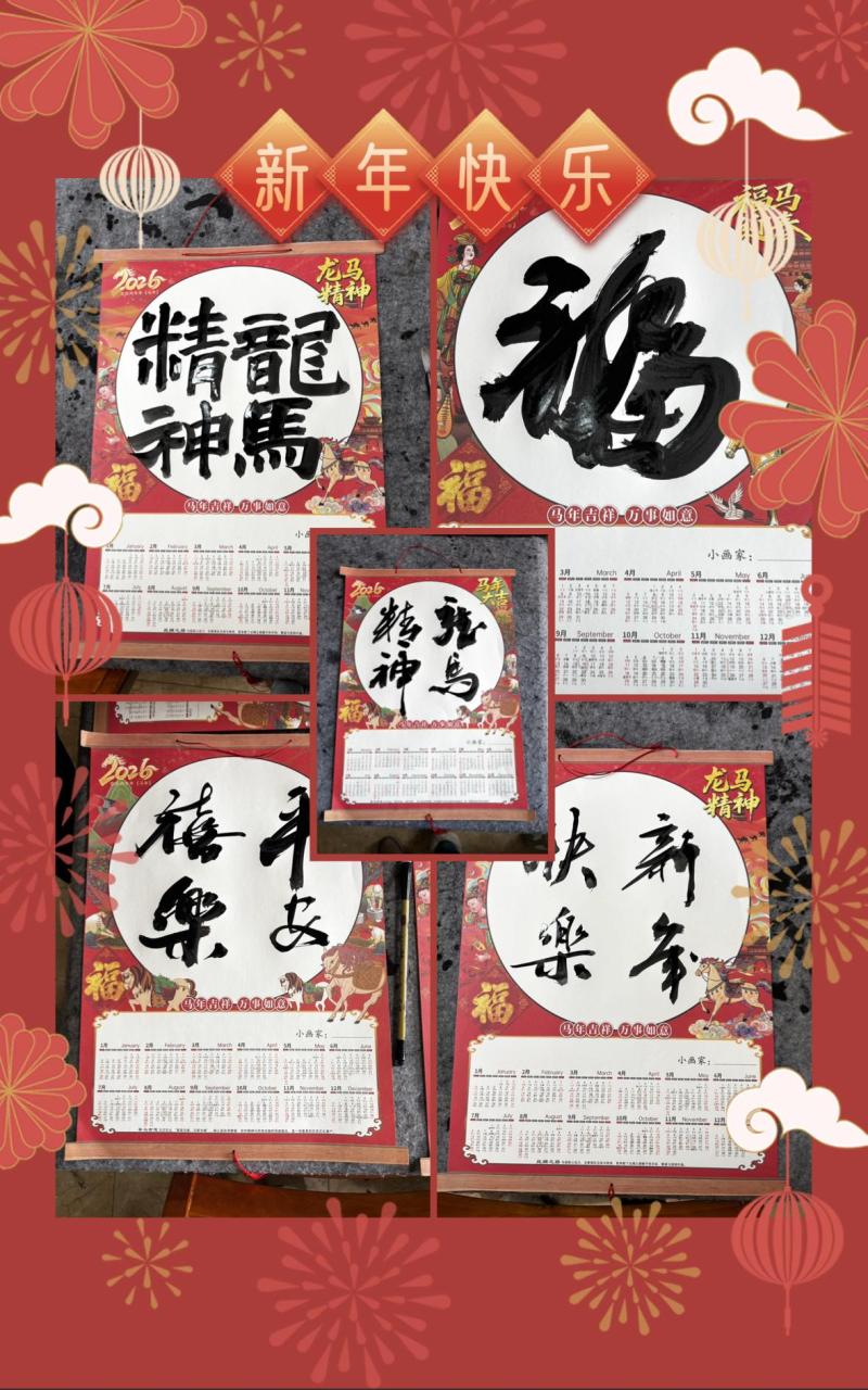 活動現場,退休老干部和大學生志愿者端坐案前,筆鋒蒼勁有力,落筆沉穩大氣,筆下的“?!弊謭A潤飽滿,“平安喜樂”“福壽綿長”等祝福語筆力遒勁,每一筆都飽含著對鄰里的深切關懷,對新春的美好期許。一張張空白日歷,在大家的共同努力下,變得色彩斑斕、寓意深遠。