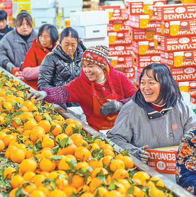 四川省眉山市彭山區(qū)黃豐鎮(zhèn)一家果業(yè)公司車間內(nèi),村民正在分揀耙耙柑。