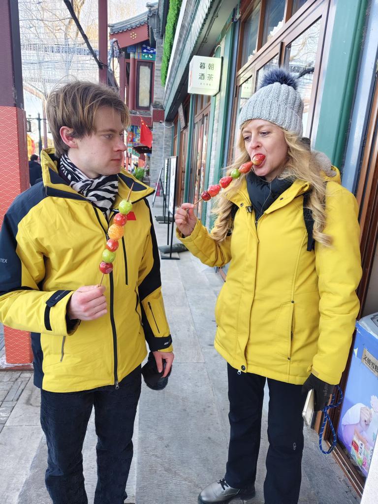 德國游客烏爾麗克與埃米爾在什剎海吃糖葫蘆。新華社記者 于佳欣 攝
