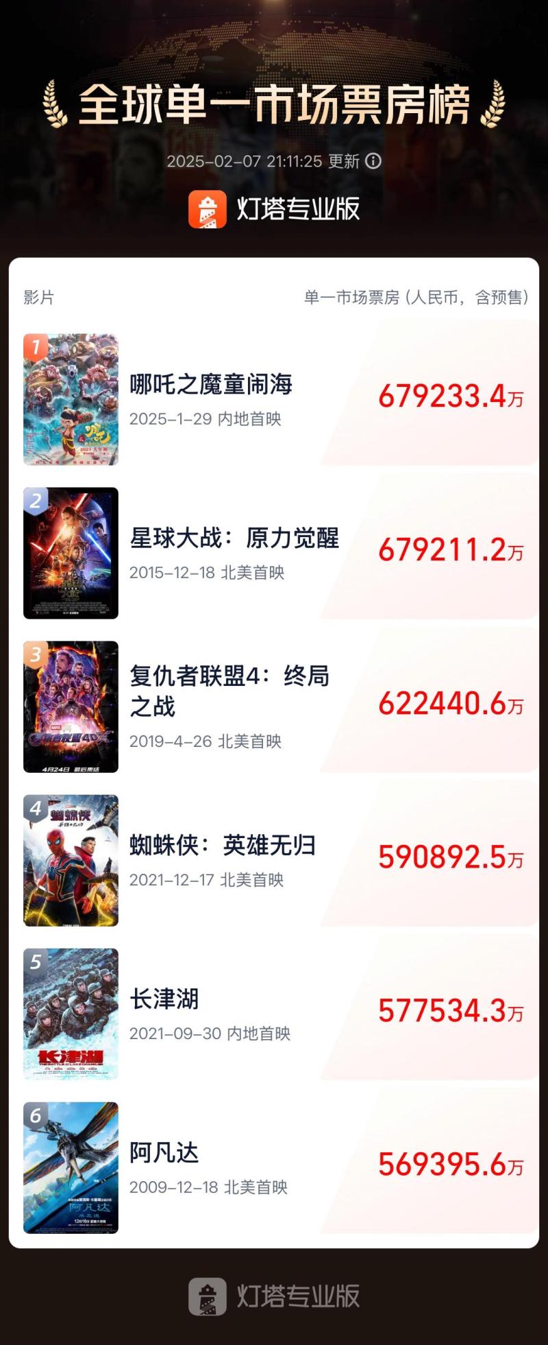 據網絡平臺數據,截至2月7日21時,電影《哪吒之魔童鬧海》票房(含預售)突破67.922億,超過《星球大戰:原力覺醒》票房成績,登頂全球影史單一市場票房榜!
