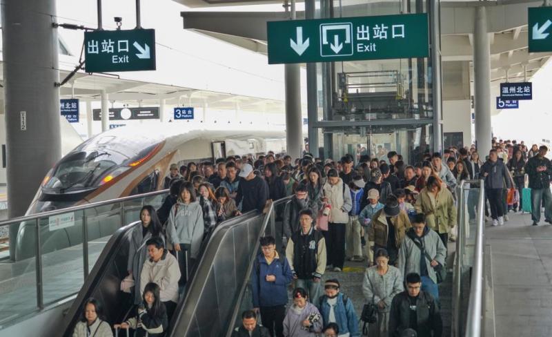 4月4日,在浙江省溫州北站,抵達的乘客提著行李有序離開站臺。新華社發(蘇巧將攝)