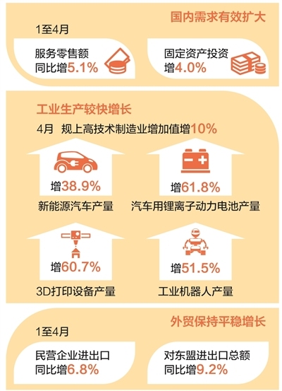 4月份,擴大內需戰略持續推進,國內需求有效擴大。