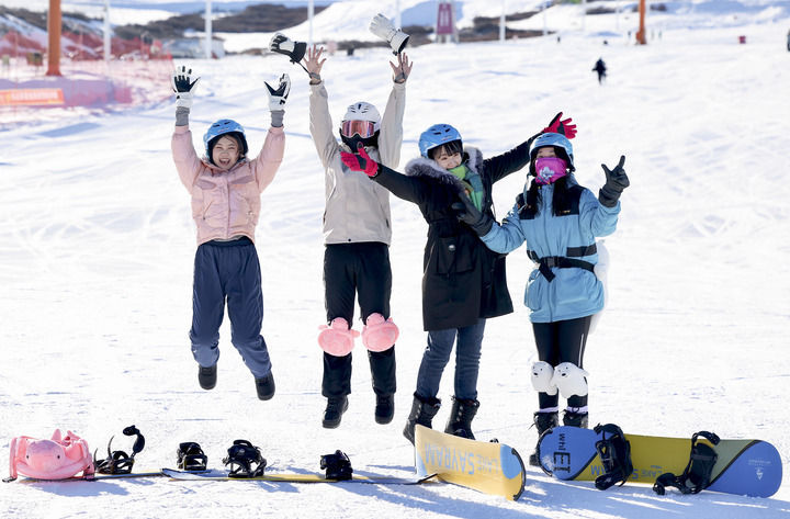 2025年1月27日,幾名滑雪愛好者在新疆絲綢之路山地度假區合影留念。新華社記者 王菲 攝