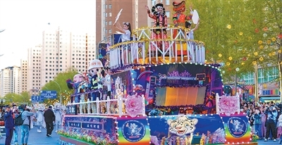 傍晚時分,青海西寧市城北區(qū)豹街開啟花車巡游。