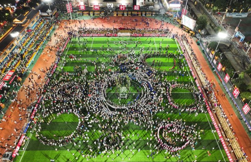 8月23日,人們在貴州“村超”球場跳苗族蘆笙舞(無人機照片)。2025年首屆“村超”全國賽總決賽在貴州榕江縣“村超”球場舉行。廣東肇慶金利誠峻足球隊2:0戰勝廣東和平商會足球隊,斬獲全國總冠軍。賽事期間同時舉辦豐富多彩的民族歌舞展演、無人機表演、大型煙花秀,吸引數萬觀眾現場觀賽。新華社記者 楊文斌 攝