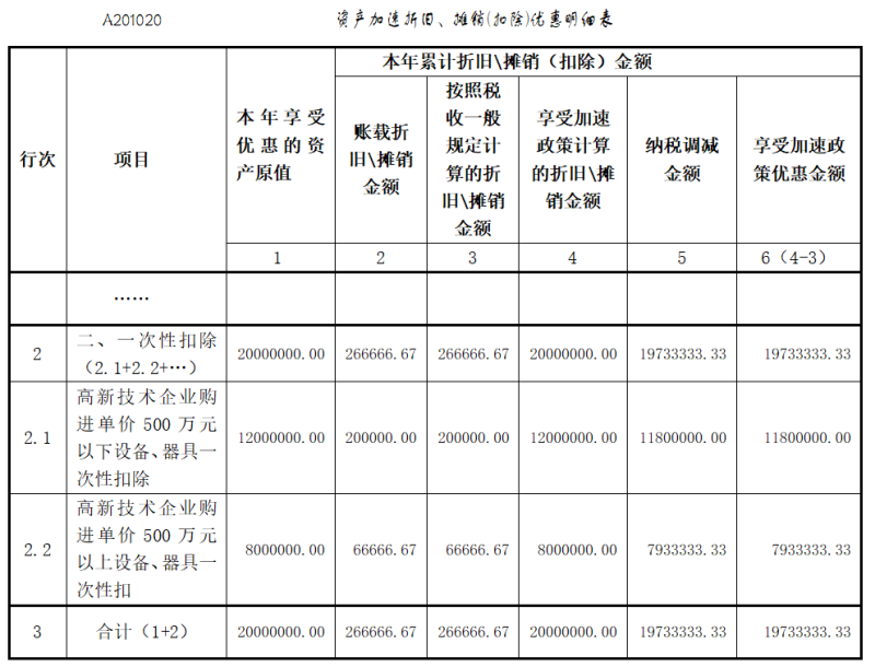 第一步,先填報一次性扣除情況。對于單價500萬元以下設(shè)備、器具,在《資產(chǎn)加速折舊、攤銷(扣除)優(yōu)惠明細表》(A201020)第2行“二、一次性扣除”下的明細行次中填寫“高新技術(shù)企業(yè)購進單價500萬元以下設(shè)備、器具一次性扣除”事項及“本年享受優(yōu)惠的資產(chǎn)原值”等信息;對于單價500萬元以上設(shè)備、器具,填寫“高新技術(shù)企業(yè)購進單價500萬元以上設(shè)備、器具一次性扣除”事項及“本年享受優(yōu)惠的資產(chǎn)原值”等信息。填寫完畢后,將該表單中“納稅調(diào)減金額”列次的合計值(第3行第5列)填寫在《中華人民共和國企業(yè)所得稅月(季)度預(yù)繳納稅申報表(A類)》(A202000)第6行“資產(chǎn)加速折舊、攤銷(扣除)調(diào)減額(填寫A201020)”中。