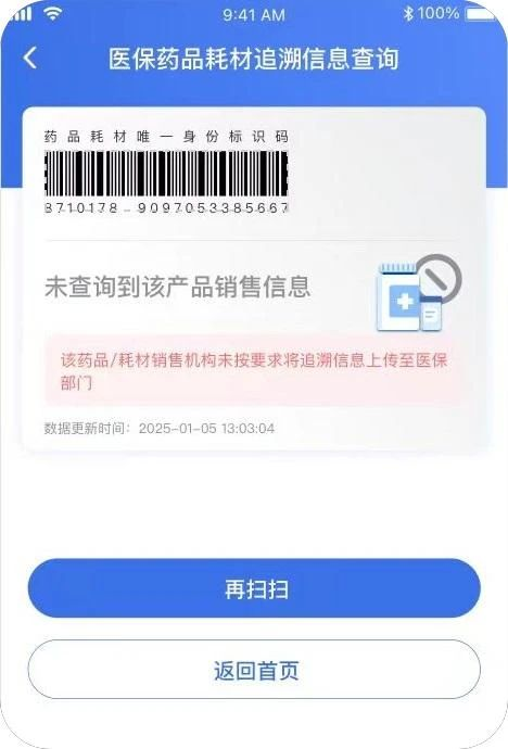 界面如提示“未查詢到該產(chǎn)品銷售信息”,則說明該藥品銷售機構(gòu)未按要求將追溯信息上傳至醫(yī)保信息平臺,患者可以要求該藥品銷售機構(gòu)出示藥品來源單據(jù),以確保藥品安全和來源渠道合法。