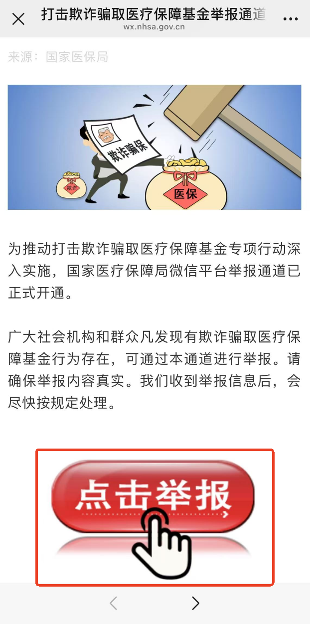 國家醫療保障局微信公眾號專門開通了網上舉報,廣大社會機構和群眾凡發現有欺詐騙取醫療保障基金行為存在,通過國家醫療保障局微信公眾號首頁下方“政民互動”版塊點擊“打擊欺詐騙保舉報”即可進入,選擇“網上信訪”或“局長信箱”反映相關情況。