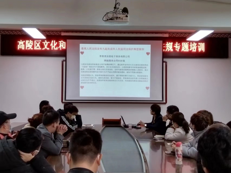 培訓會上,武律師從文化行業實際出發,理論聯系實際,結合生活中一些未成年人保護法、刑法、公益行政訴訟等案例,通過生動鮮活的語言、案例為大家進行了深入講解,使大家更加深刻地認識到了未成年人保護工作的重要性。