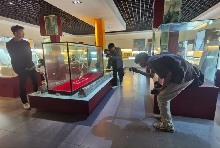 西安工商學院的學生們都拿起相機,認真、仔細的從各個角度拍攝著每一件藏品,在工作人員的解說下參觀博物館。