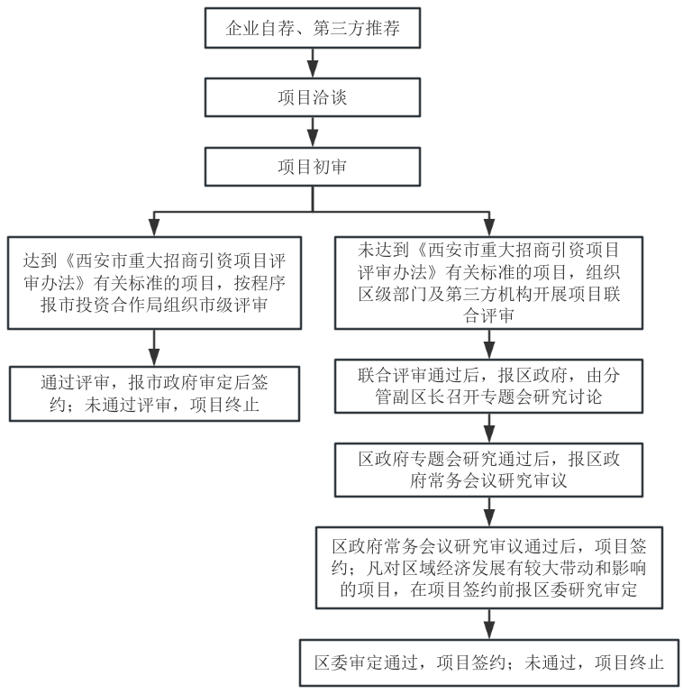 2.項(xiàng)目初審。由項(xiàng)目招商主體單位負(fù)責(zé)聯(lián)系相關(guān)職能單位對(duì)項(xiàng)目進(jìn)行初步審核。審核內(nèi)容包括:是否符合國(guó)家、省、市法律法規(guī)、產(chǎn)業(yè)政策、行業(yè)準(zhǔn)入標(biāo)準(zhǔn)、生態(tài)環(huán)境分區(qū)管控等要求;是否符合安全、環(huán)保要求;是否符合園區(qū)產(chǎn)業(yè)定位;是否符合項(xiàng)目投資要求。同時(shí),按照《西安市重大招商引資項(xiàng)目評(píng)審辦法》,滿足以下條件一項(xiàng)或多項(xiàng)的,應(yīng)委托第三方開展法律及財(cái)務(wù)盡職調(diào)查并在區(qū)級(jí)初審?fù)ㄟ^(guò)后,由區(qū)投資合作局報(bào)市投資合作局申請(qǐng)組織市級(jí)評(píng)審,形成評(píng)審結(jié)果報(bào)市政府審定:(1)總投資30億元以上制造業(yè)項(xiàng)目;(2)合同外資1億美元以上制造業(yè)項(xiàng)目;(3)總用地300畝以上的項(xiàng)目;(4)引進(jìn)各類支持政策2億元以上的制造業(yè)項(xiàng)目;(5)確需評(píng)審的其他招商引資項(xiàng)目。
