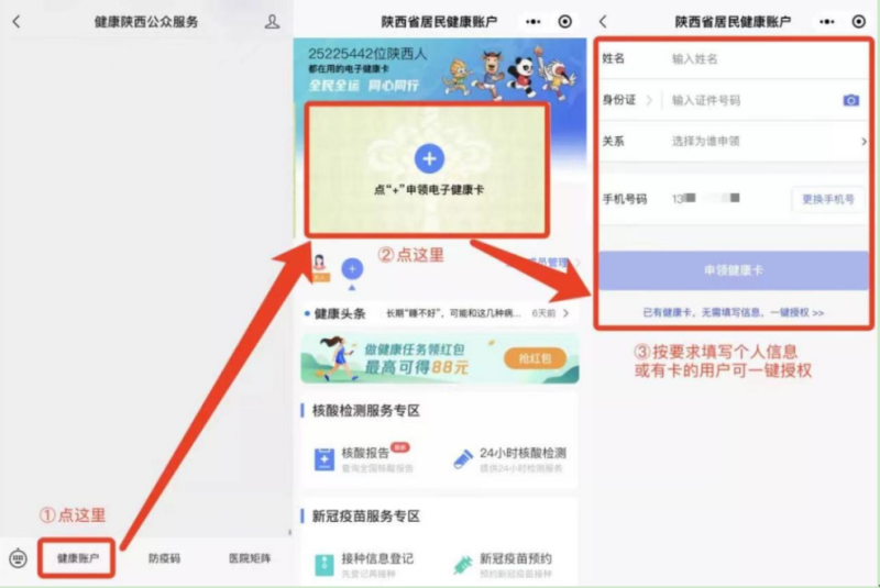 點擊底部菜單欄“健康賬戶”→“點+申領電子健康卡”→按要求填寫個人信息/有卡用戶可一鍵授權→成功申領電子健康卡