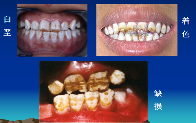 氟斑牙:表現為牙齒表面粗糙、沒有光澤,出現白色、黃色、棕色甚至的黑色的花紋、斑點或缺損,尤其是門牙損害最嚴重。