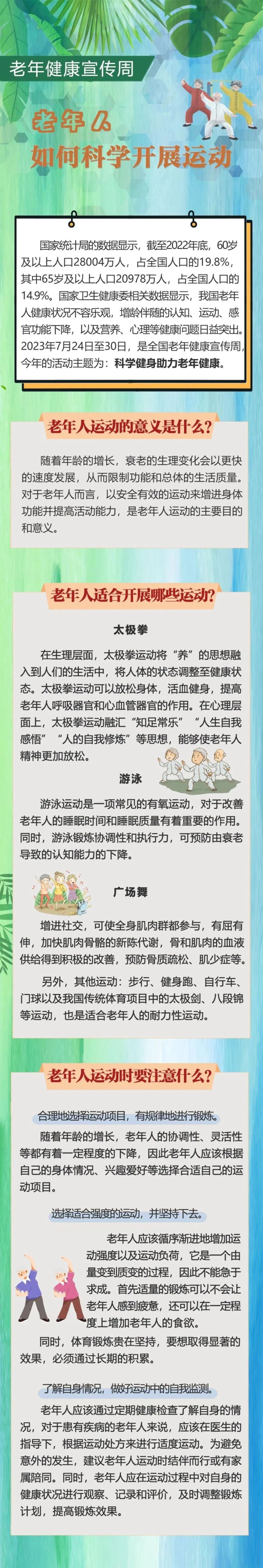 為宣傳普及老年健康政策和科學知識,切實提高老年人健康水平,國家衛(wèi)生健康委會同國家體育總局、國家中醫(yī)藥管理局,以“科學健身助力老年健康”為主題,于2023年7月24日-30日組織開展2023年全國老年健康宣傳周活動。