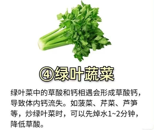 一些蔬菜如菠菜、莧菜等,含有較多的草酸(如果將這些菜在沸水中焯一下,濾去水再烹調(diào),可減少部分草酸)非常容易與鈣結(jié)合成為不溶性的鈣鹽,很難被人體吸收利用,從而影響鈣的吸收。