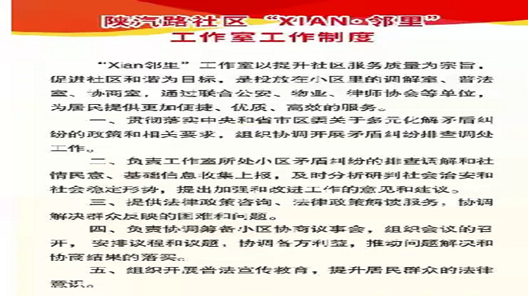 事情“誰來說”,多方一起說。"XIAN·鄰里"工作室由社區(qū)黨支部主導(dǎo),成員有公安、物業(yè)、律協(xié)等多家駐區(qū)單位和小區(qū)志愿者,以構(gòu)建和諧社區(qū)為共同目標(biāo)。工作室上墻了工作室制度與公示牌,在不同的矛盾糾紛調(diào)解事件上哪方有所長,哪方就來說。