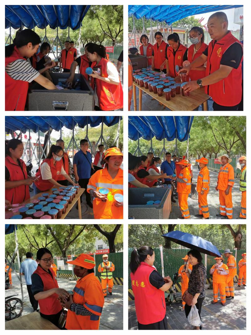 活動中,社區志愿者和工作人員將一杯杯綠豆湯,一條條擦汗毛巾送到高溫下依舊堅守崗位的戶外工作者、環衛工人手中,并叮囑他們一定要注意防暑降溫,多飲水,注意休息,合理安排工作和休息時間,做好個人防護。同時社區工作人員向高齡、獨居老人宣傳防暑降溫知識、夏日出行注意事項,再三叮囑叔叔阿姨們高溫天氣一定要及時為身體補充水分。