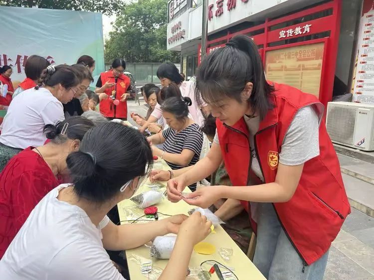在民俗體檢區(qū),傳統(tǒng)習(xí)俗體驗(yàn)精彩紛呈。充氣龍舟趣味賽中,居民與志愿者組隊(duì)協(xié)作,伴著陣陣吶喊聲奮力“劃槳”,感受龍舟競(jìng)渡的熱血與團(tuán)結(jié);包粽子攤位前,老手新手齊上陣,從粽葉折疊到糯米填充,包出傳統(tǒng)三角粽、枕頭粽。葉折疊、餡料調(diào)配,現(xiàn)場(chǎng)飄滿糯米清香;香囊DIY區(qū)域,在志愿者指導(dǎo)下學(xué)習(xí),居民縫制艾草香囊,將祈福納祥的美好寓意縫入五彩絲線。活動(dòng)不僅讓居民沉浸式體驗(yàn)端午文化,更促進(jìn)了親子互動(dòng)與鄰里交流。