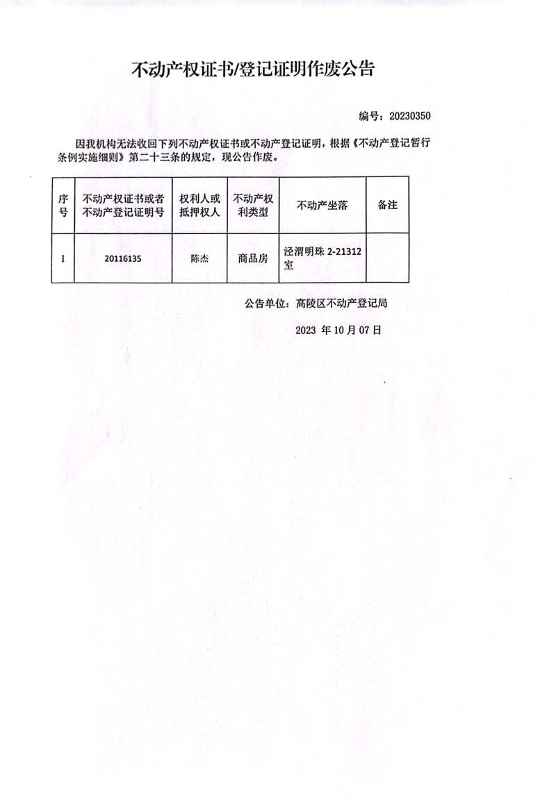 不動產(chǎn)權(quán)證書/登記證明作廢公告 編號:20230350
